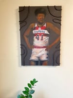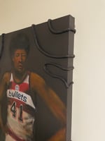 This striking mixed media painting—crafted in acrylic and oil—pays tribute to basketball legend Wes Unseld during his prime with the Baltimore Bullets in 1970. Centered in his iconic #41 jersey, Unseld stands firm and commanding, a visual echo of his reputation as one of the most powerful rebounders and unshakable leaders of his era. The textured rope elements surrounding the figure add symbolic weight, representing both the physical strength and the unbreakable resolve he brought to the court. The painting fuses realism with a stylized intensity, capturing not only the athlete but the legacy of determination he embodied.